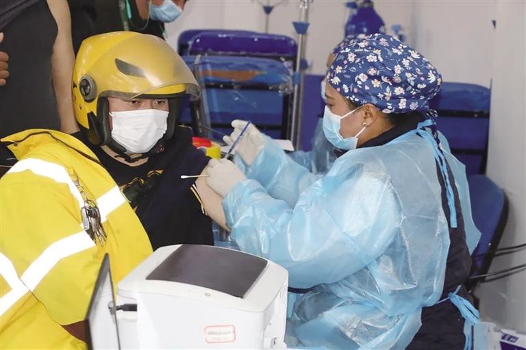 醫務人員為美團外賣騎手接種第三針新冠疫苗。圖片來自拉薩工會微信公眾號