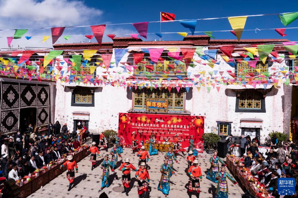 當(dāng)日,西藏拉薩市城關(guān)區(qū)在八廓街老大院夏扎內(nèi)開展迎春節(jié)藏歷新年主題活動,來自大院附近的多民族居民一起載歌載舞,迎接春節(jié)、藏歷新年。
