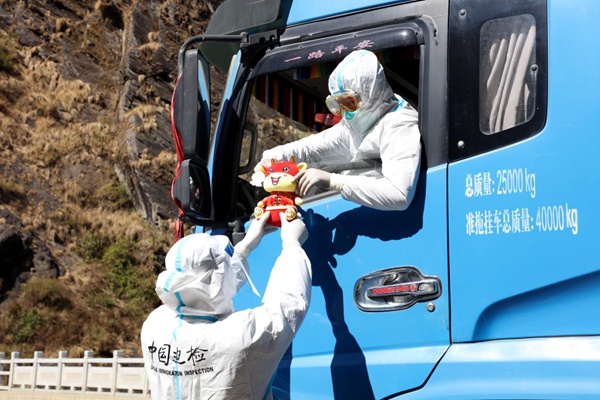 聶拉木邊檢站移民警察為貨車司機送新年禮物。李東洪攝
