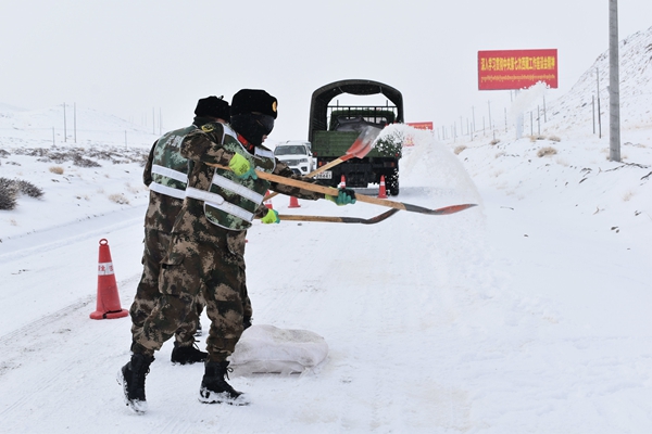 圖為武警官兵正在對(duì)結(jié)冰路段拋灑融雪劑。貢鎳攝