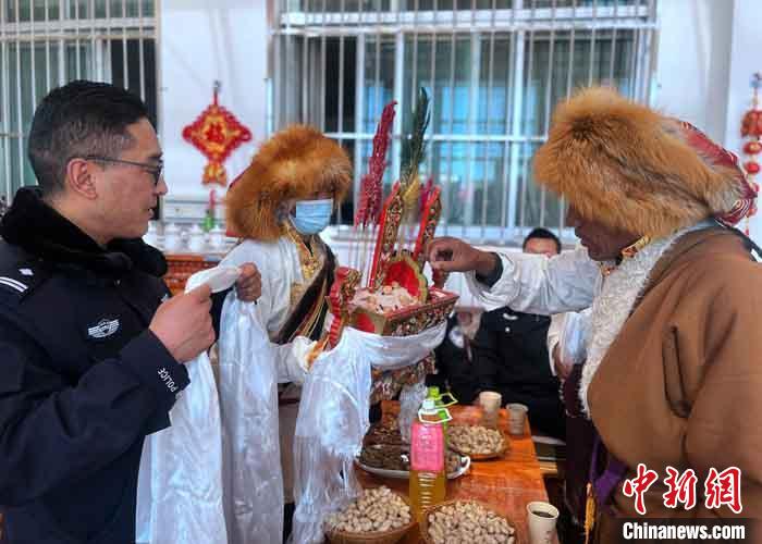 圖為民警向民眾敬獻哈達 。柳志軍 攝