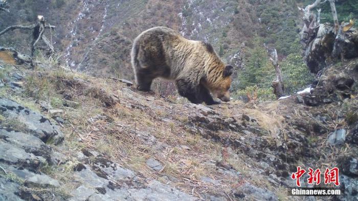 資料圖為2021年10月29日在西藏自治區(qū)丁青縣境內(nèi)由紅外相機(jī)拍攝到的棕熊活動影像。 中新社發(fā) 山水自然保護(hù)中心 供圖