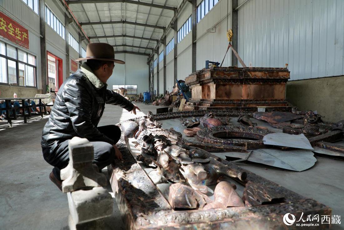 工廠內(nèi)傳承人羅布占堆講述鍛銅制作過(guò)程。人民網(wǎng) 次仁羅布攝