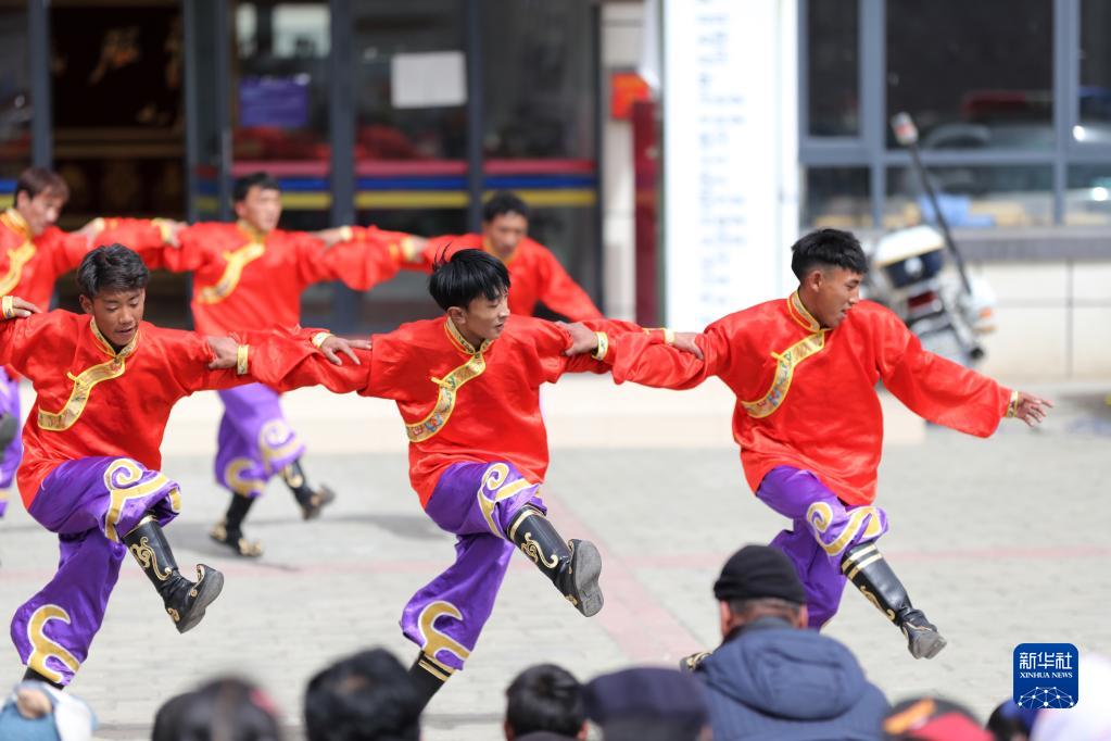 搬遷牧民在搬遷點(diǎn)廣場(chǎng)上跳起民族舞蹈,迎接藏歷新年(2月28日攝)。新華社記者 覺果 攝