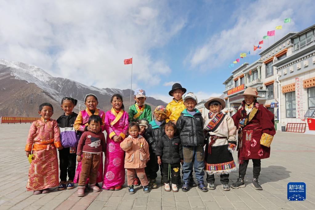 部分搬遷牧民家的孩子在搬遷點(diǎn)廣場(chǎng)上合影,他們當(dāng)中大一點(diǎn)的出生在榮瑪,最小的幾個(gè)出生在古榮(2月28日攝)。新華社記者 姜帆 攝