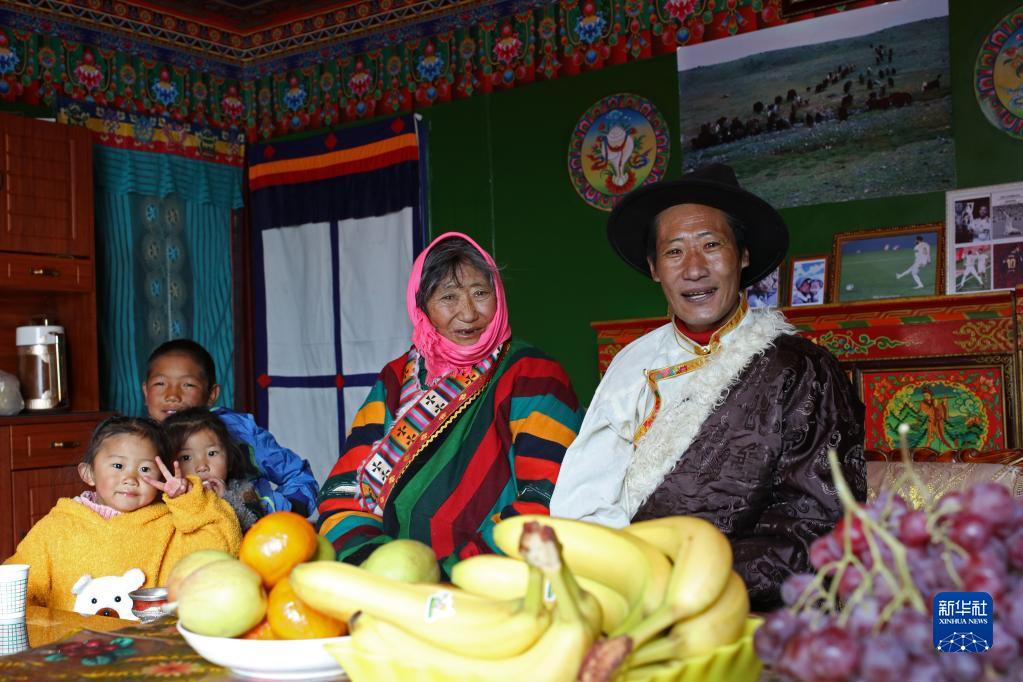 搬遷牧民仁增(右一)一家為藏歷新年購買了很多新鮮水果,他的小女兒古榮卓瑪(左一)是搬遷點(diǎn)第一個(gè)出生的孩子(2月28日攝)。新華社記者 姜帆 攝