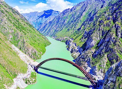 復(fù)興號(hào)列車行駛在川藏鐵路拉林段藏木特大橋。新華社發(fā)