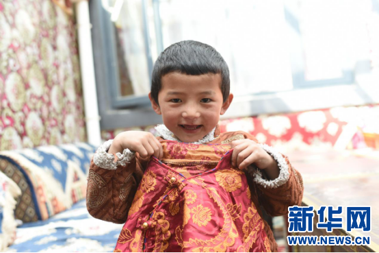 2月27日,在榮瑪鄉高海拔生態搬遷點藏曲村今年5歲的晉美塔杰展示新年的衣服。新華網 旦增努布 攝