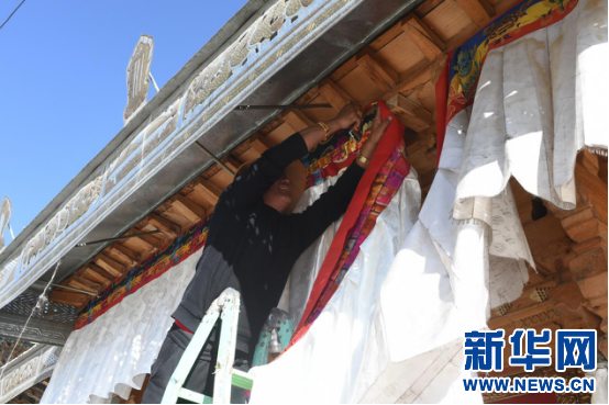 3月2日,乃東區郭沙村村民巴桑在更換大門的香布(一種藏式裝飾)。新華網 旦增努布 攝