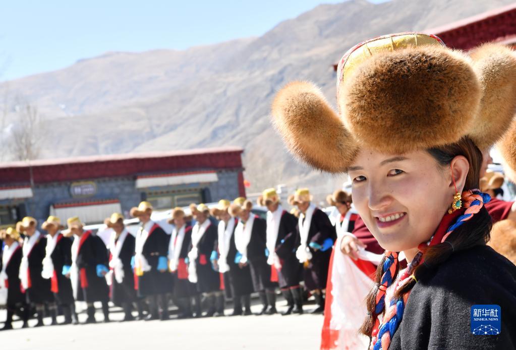 3月3日,西藏山南市貢嘎縣崗堆鎮農民穿著嶄新的氆氌藏裝參加藏歷新年活動。新華社記者 覺果 攝