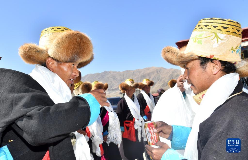 3月3日,西藏山南市貢嘎縣崗堆鎮農民互相敬酒,慶賀藏歷水虎新年。新華社記者 覺果 攝