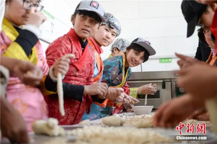 2017年2月25日,幾名藏族學生在制作“古突”。當日,安徽省合肥市第三十五中學西藏班的藏族學生通過制作“古突”、表演文藝節目等方式,迎接藏歷火雞新年的到來。中新社記者 張婭子 攝