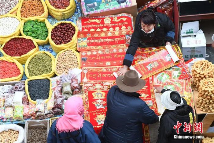 2021年2月,西藏拉薩,藏歷新年來臨之際,民眾選購藏式春聯。中新社記者 貢嘎來松 攝