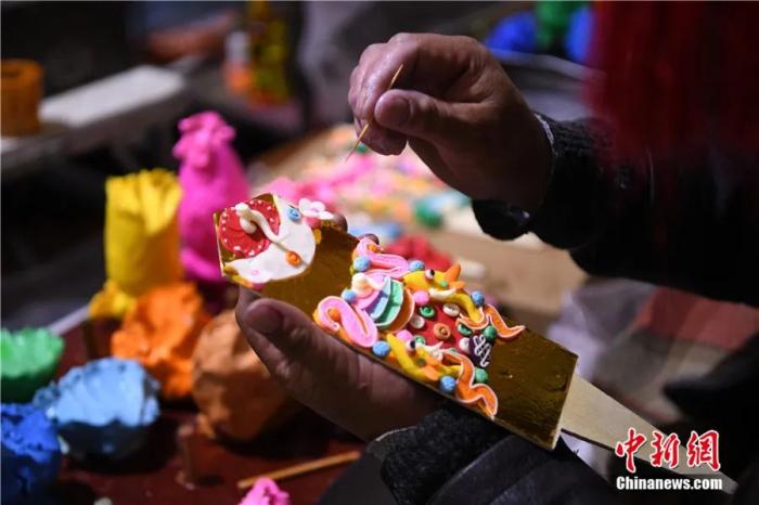 2022年2月14日,酥油花手工藝人在拉薩八廓古城現場制作。藏歷新年臨近,酥油花在年貨市場熱銷。酥油花在藏語中稱為“孜扎”,是古時藏傳佛教信眾因冬季沒有鮮花供佛而發明的替代品,如今已是藏族老百姓家庭中必備的年貨之一。中新社記者 貢嘎來松 攝