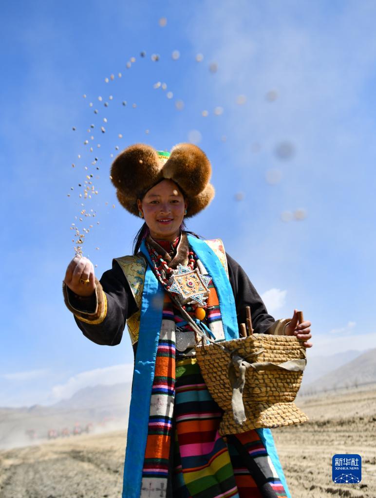 村民在西藏日喀則市江孜縣努康村參加春耕儀式時播撒種子(3月16日攝)。新華社記者 晉美多吉 攝
