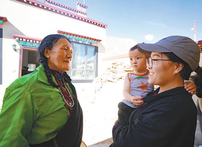 雙湖縣措折羌瑪鄉干部邊巴拉姆(右一)在搬遷群眾家走訪。記者 徐馭堯攝