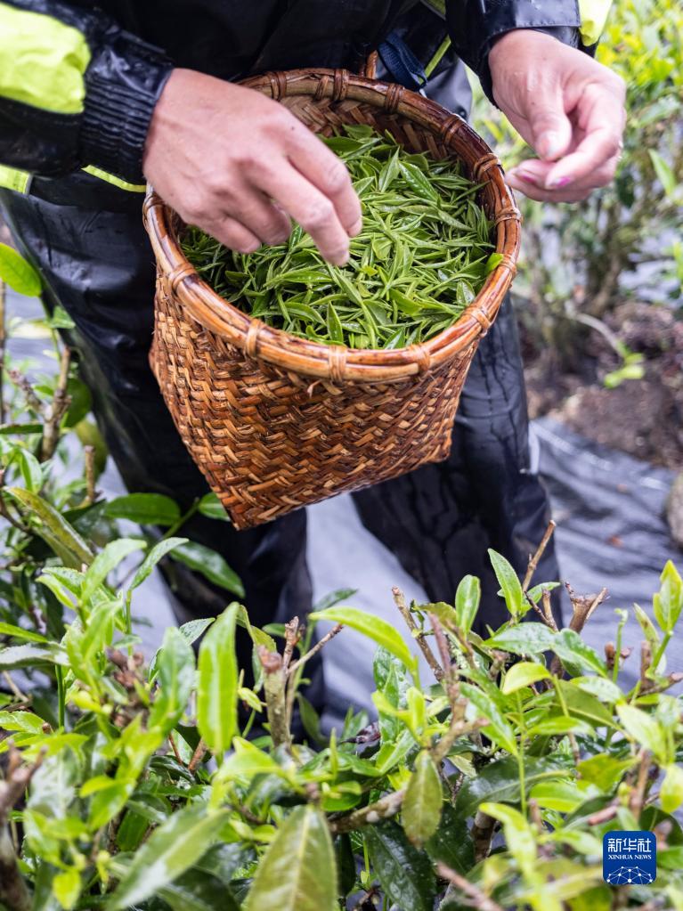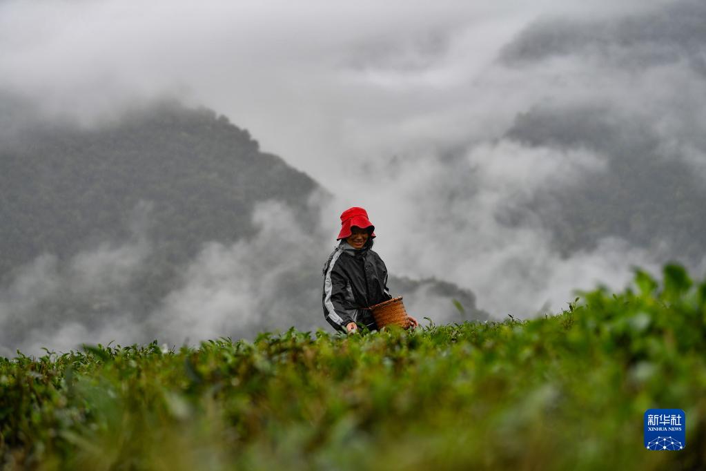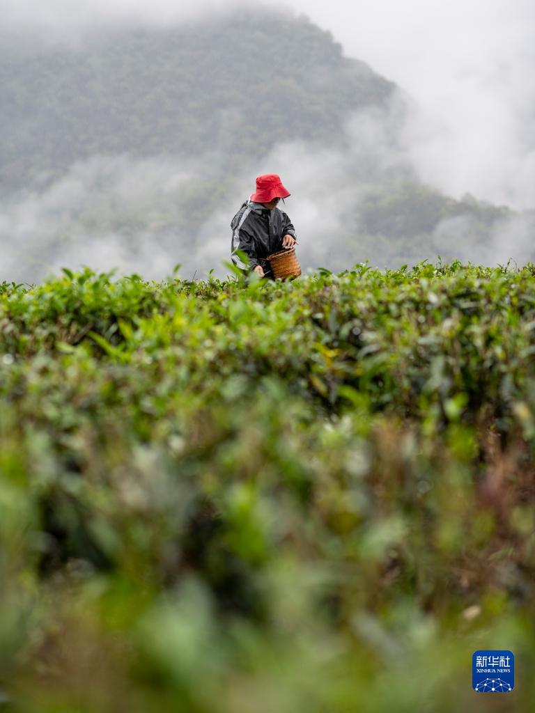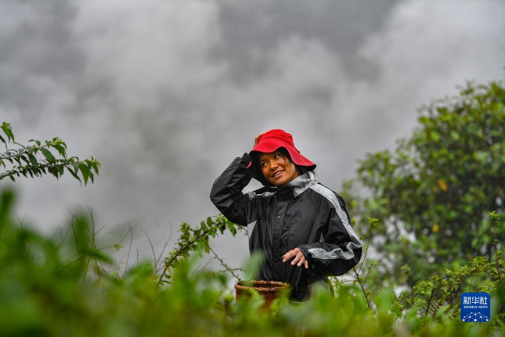 西藏林芝市墨脫縣德興鄉荷扎村的村民貢桑拉姆在采茶(4月16日攝)。27歲的門巴族姑娘貢桑拉姆家有十余畝茶田,僅依靠茶葉,她家每年能增收兩萬余元。新華社記者 晉美多吉 攝