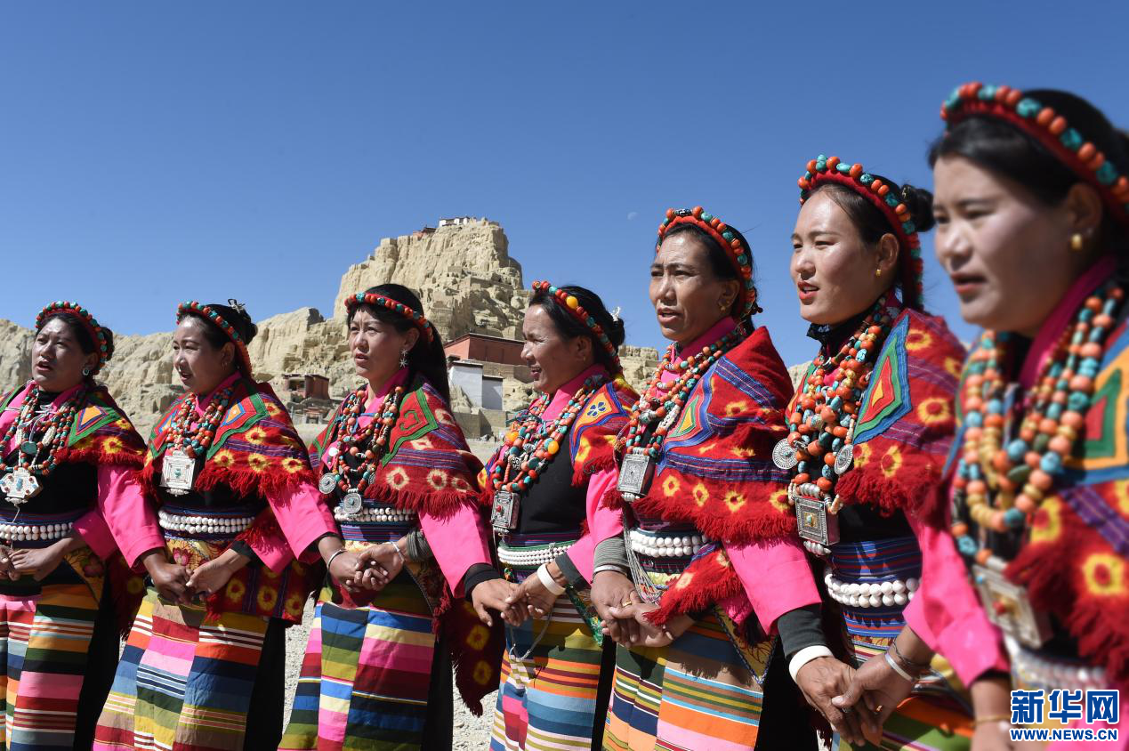 4月23日,當地群眾在古格王朝遺址腳下表演宣舞。新華網 旦增努布攝