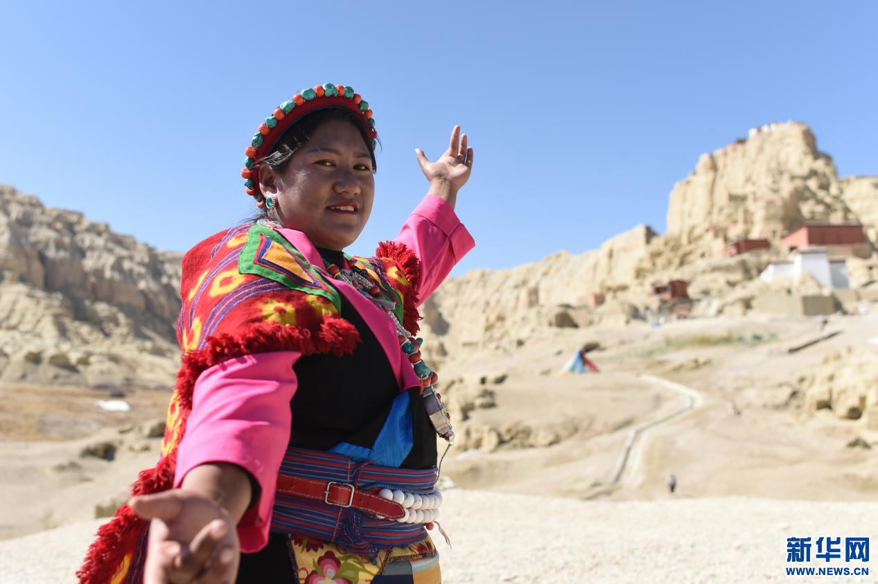 4月23日,一名當地群眾在古格王朝遺址腳下表演宣舞。新華網 旦增努布攝