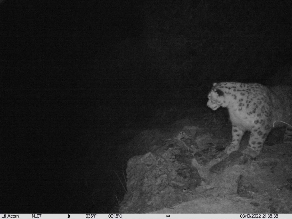 紅外相機監測照片顯示,今年3月,一只成年雪豹走到了一臺位于山脊線上的紅外相機觸發裝置前,不斷地上前用鼻子觸碰,并且淘氣地在鏡頭前呼出了一股熱氣。