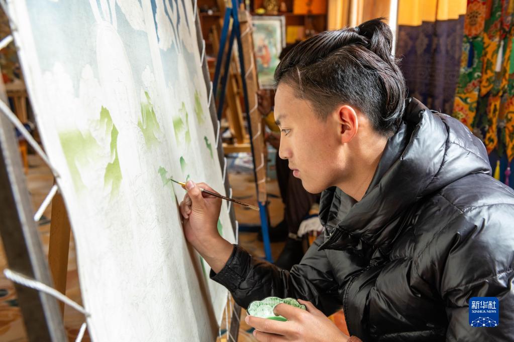 在昌都市察雅縣的產業車間,唐卡畫師在作畫(4月8日攝)。新華社記者 周荻瀟 攝