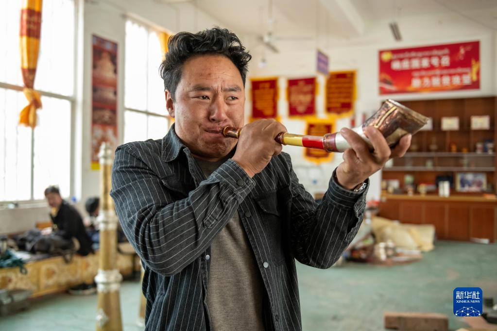 在昌都市察雅縣的產業車間,手工藝人吹響已加工好的樂器(4月8日攝)。新華社記者 周荻瀟 攝