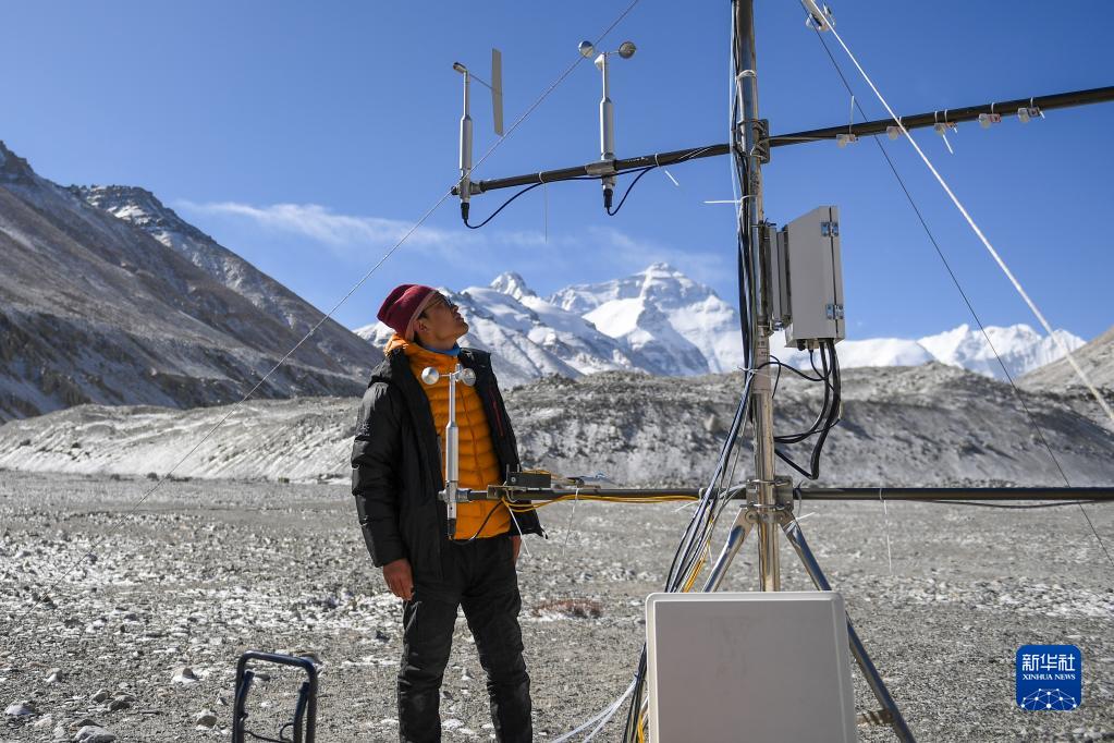 在珠峰登山大本營(yíng),科研人員檢查臭氧通量裝置運(yùn)行情況(5月3日攝)。新華社記者 姜帆 攝