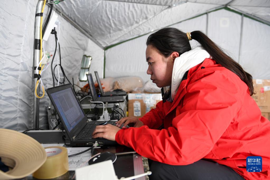 在珠峰登山大本營(yíng),科研人員查看大氣數(shù)據(jù)(5月3日攝)。新華社記者 姜帆 攝