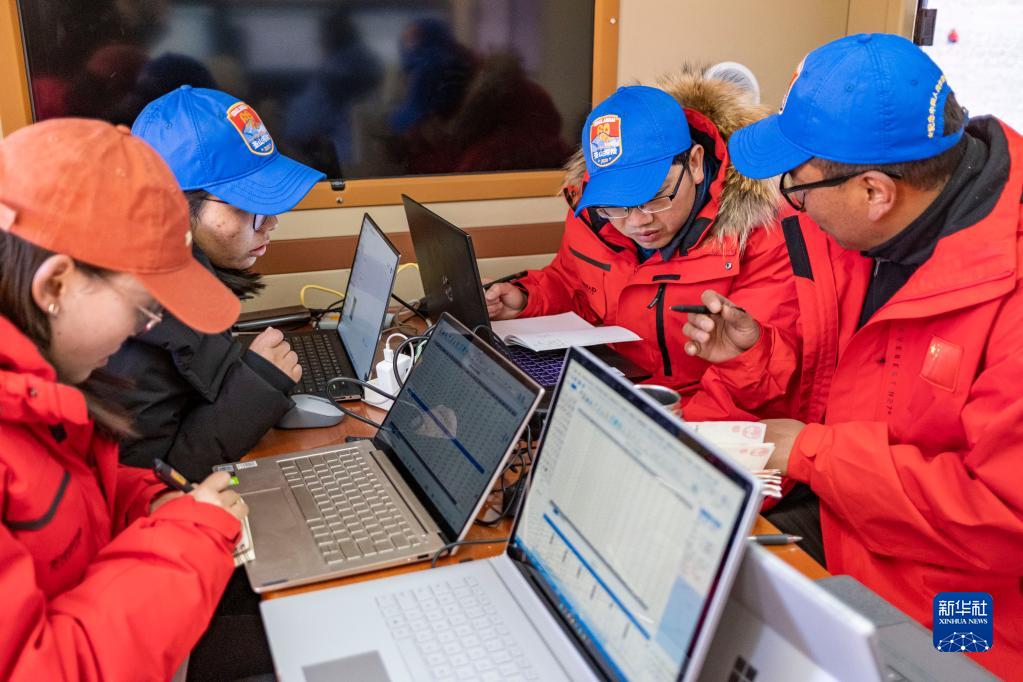 在珠峰登山大本營(yíng)的氣象應(yīng)急保障車內(nèi),西藏自治區(qū)氣象局工作人員在查看實(shí)時(shí)氣象數(shù)據(jù)(5月3日攝)。新華社記者 孫非 攝