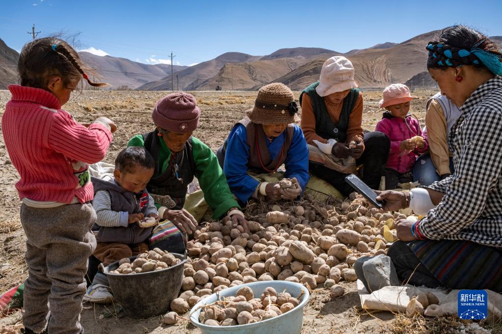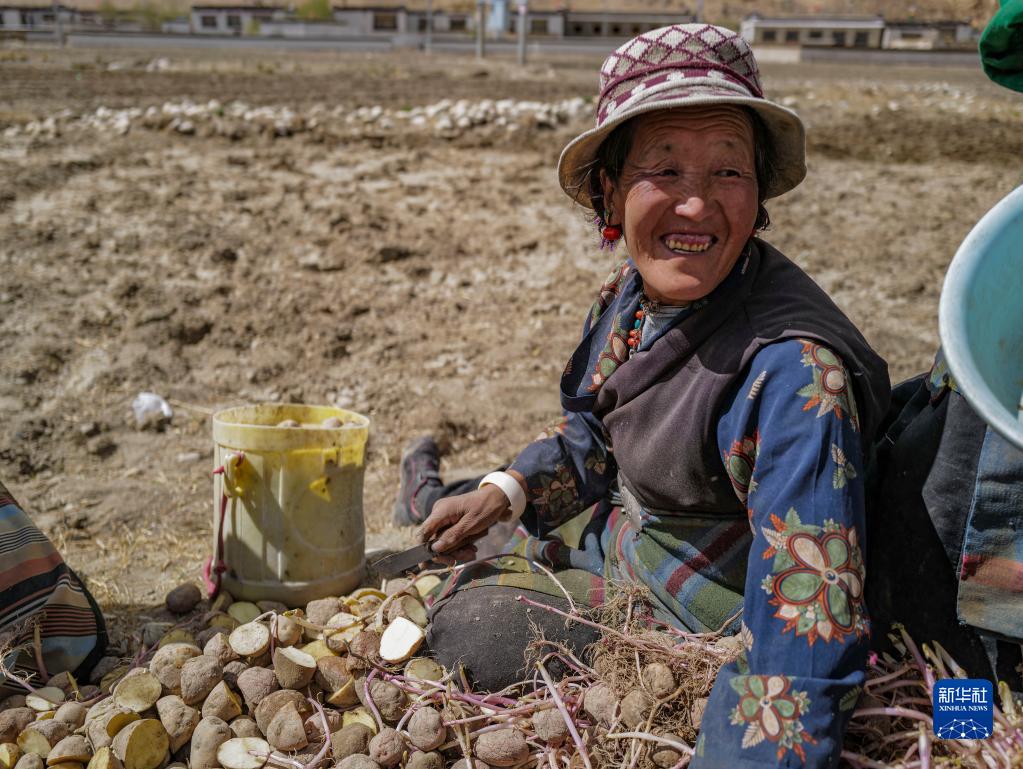 西藏定日縣扎西宗鄉日白拉新村的村民在切發芽的土豆(5月10日攝)。新華社記者 孫非 攝