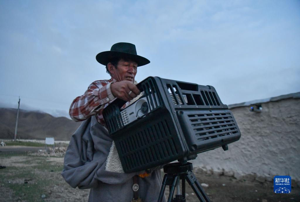 在西藏當雄縣拉多村,羅珠在準備放映電影所需的器材(5月20日攝)。新華社記者 卞婷 攝