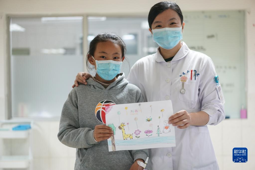 小患者次仁旺姆將自己的畫送給護士湯燕,祝她護士節快樂(5月12日攝)。