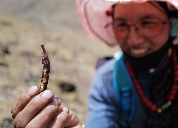 牧民其美嘎德展示剛采集到的蟲草(5月25日攝)。新華社記者 劉潁 攝