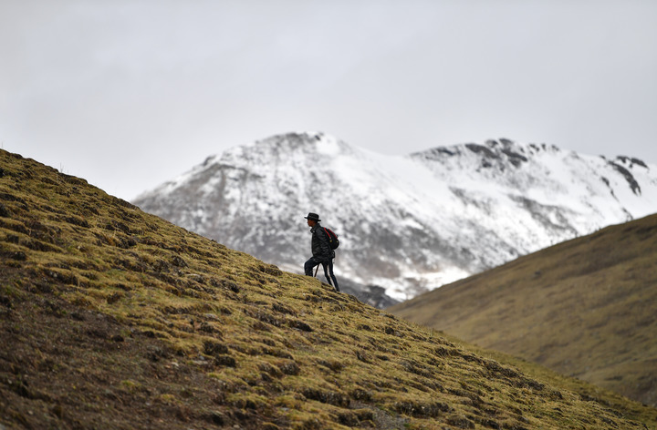 沿著陡峭山坡,攀至海拔超過4700米的地方,才能來到冬蟲夏草藏身的草甸。一條腿彎曲、一條腿伸直、手肘支撐、俯身低頭,高原上的村民就這樣以擁抱大地的姿態,搜尋著隱藏其中的暗棕色芽尖——冬蟲夏草。剛剛將蟲草挖出,采挖蟲草的牧民就拿起鋤頭用鈍頭輕敲地面,把掀開的土壤回填到原位——他們用這樣簡單而樸實的方式保護著大自然的饋贈,為來年冬蟲夏草的生長打好基礎。