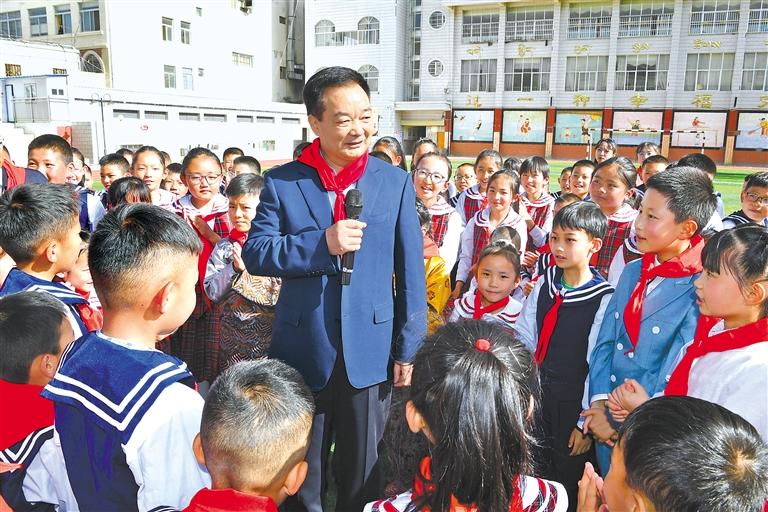 拉薩市第一小學是西藏和平解放后拉薩開辦的第一所公立小學。今年將召開黨的二十大,學校迎來建校70周年,這個主題隊日活動格外有意義。上午9時30分許,王君正來到拉薩市第一小學,朝氣蓬勃的少先隊員代表迎上前高聲問好,并為王君正系上鮮艷的紅領巾,主動牽著他的手走向校園。