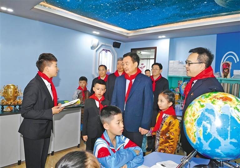 拉薩市第一小學正在開展的“鑄牢中華民族共同體意識”少先隊活動課豐富多彩。音樂室里孩子們演奏的六弦琴韻律歡快,王君正駐足傾聽,夸贊孩子們多才多藝;科技工作室里老師正引導孩子們做科學實驗,王君正認真觀看,勉勵孩子們從小樹立科學觀念,講科學、愛科學、學科學、用科學,永葆求知探索之心;走進美術室,看到孩子們埋頭練習,王君正關切地詢問:“現在孩子們近視的多嗎?”叮囑說,要注意保護孩子們的視力,呵護好他們的身心健康。