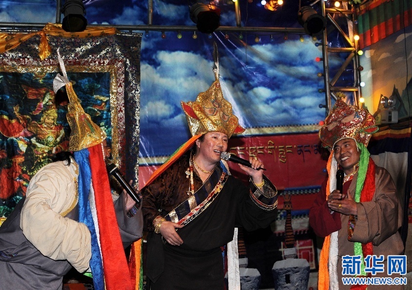 2015年12月30日晚,在拉薩舉行的西藏自治區2016年《吉祥彩虹》新年音樂會上,演員表演格薩爾說唱。新華社記者 晉美多吉攝