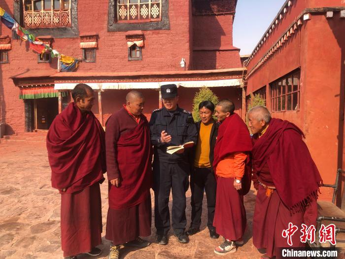 圖為楊聰向轄區僧尼宣講最新的政策。 科加派出所供圖