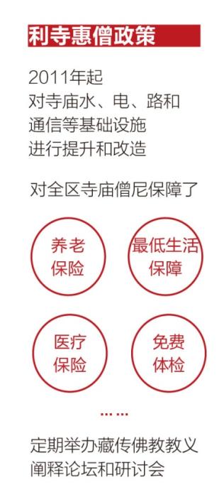 西藏出臺了一系列利寺惠僧政策,對全區寺廟僧尼保障了養老保險、最低生活保障、醫療保險、重大疾病醫療保險、免費體檢等。同時定期舉辦藏傳佛教教義闡釋論壇和研討會,鼓勵藏傳佛教界代表人士對藏傳佛教經典教義作出符合國家法律法規、社會主義核心價值觀和中華優秀傳統文化精神的新闡釋,藏傳佛教中國化邁出了新步伐。