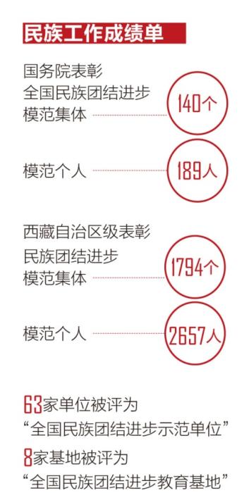 在西藏,民族團結家庭并不是個例,有不少個人和集體也為民族團結進步事業作出了突出貢獻。目前,西藏全區榮獲國務院表彰全國民族團結進步模范集體140個、模范個人189人;西藏自治區級表彰民族團結進步模范集體1794個、模范個人2657人;63家單位被評為“全國民族團結進步示范單位”,8家基地被評為“全國民族團結進步教育基地”。拉薩、日喀則、昌都、阿里、林芝5個市地成功創成“全國民族團結進步示范地(市)”。