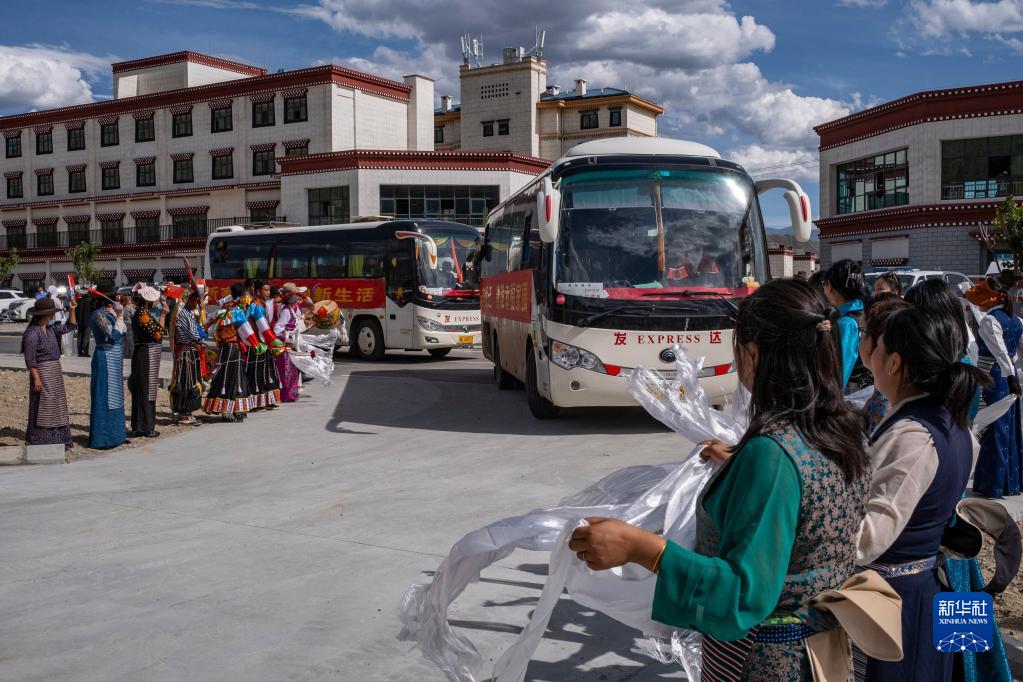 一陣陣激昂的藏戲鼓聲、一聲聲“歡迎到家”的美好祝福,當地群眾手舉象征五谷豐登的“切瑪盒”,逐一獻上哈達,迎接新鄰居。