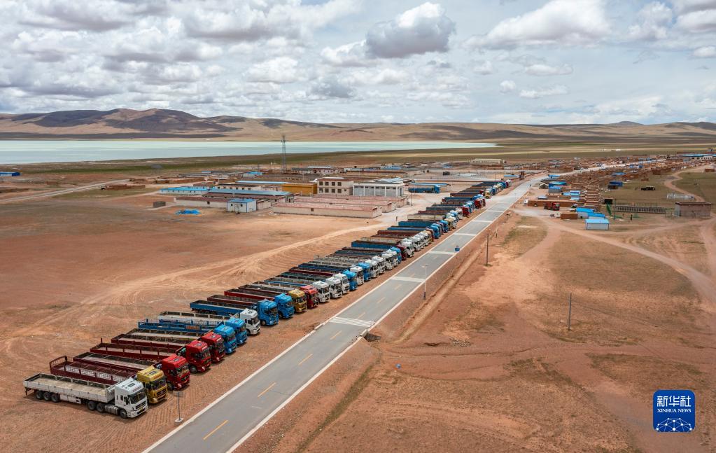 在雙湖縣多瑪鄉拍攝的負責運送搬遷群眾家具的貨車(7月12日攝,無人機照片)。新華社記者 孫非 攝