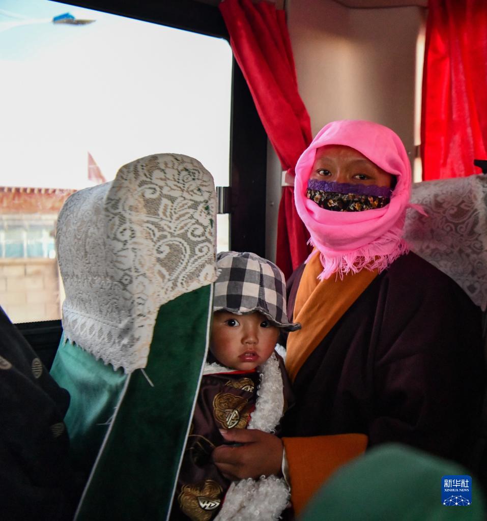 雙湖縣多瑪鄉果根擦曲村牧民次仁央金(右)乘坐大巴,準備前往森布日安置點(7月19日攝)。新華社記者 晉美多吉 攝