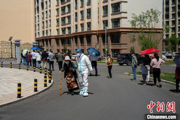 圖為8月12日,拉薩一小區內,工作人員攙扶藏族老人進行核酸檢測。 江飛波 攝