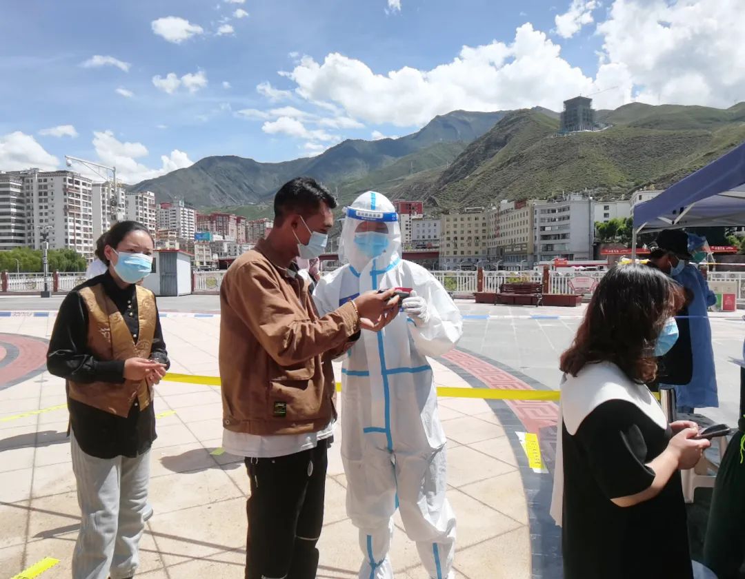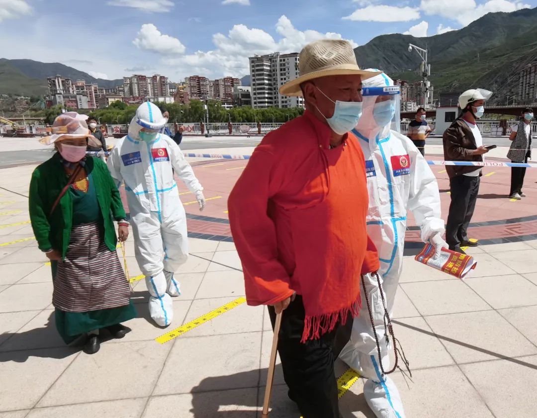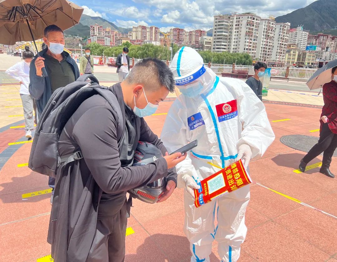 “為了您的安全,請保持1米以上間隔,謝謝。”晚上9點多,在茶馬廣場,支隊三級消防士張興梁,依然堅守在抗疫一線,維持著排隊做核酸的長隊。從早上7點開始,張興梁和其他消防隊員已堅守了14個多小時。“西藏晝夜溫差特大,白天防護服里面衣服都濕透了,但是到晚上這個點已經干了,正好不用換衣服了。”張興梁打趣的說到。