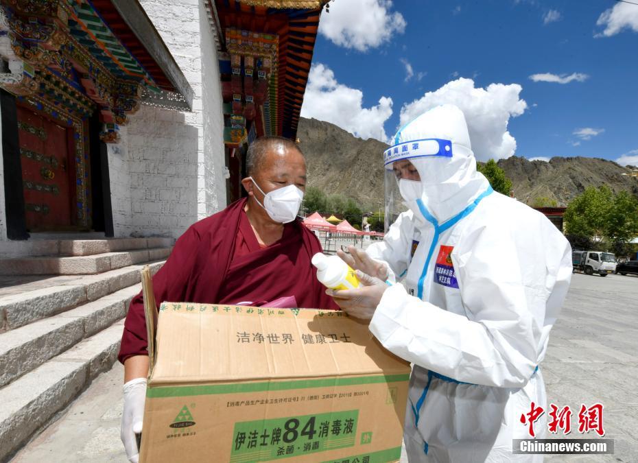 8月14日,西藏拉薩,志愿者為哲蚌寺送來防疫物資,并為僧人講解消毒液使用方法。當日,拉薩市應對新冠肺炎疫情工作領導小組決定,至8月15日凌晨3時的拉薩主城區消殺管理時間,再延長三天至8月18日凌晨3時,在拉薩主城區以社區網格為基本單位,快速精準開展多輪全員核酸篩查。 中新社記者 李林 攝