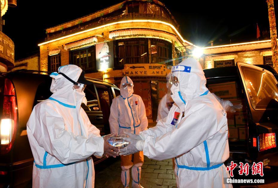 8月14日,西藏拉薩,志愿者在八廓街內為防疫人員送去抗疫物資。當日,拉薩市應對新冠肺炎疫情工作領導小組決定,至8月15日凌晨3時的拉薩主城區消殺管理時間,再延長三天至8月18日凌晨3時,在拉薩主城區以社區網格為基本單位,快速精準開展多輪全員核酸篩查。 中新社記者 李林 攝