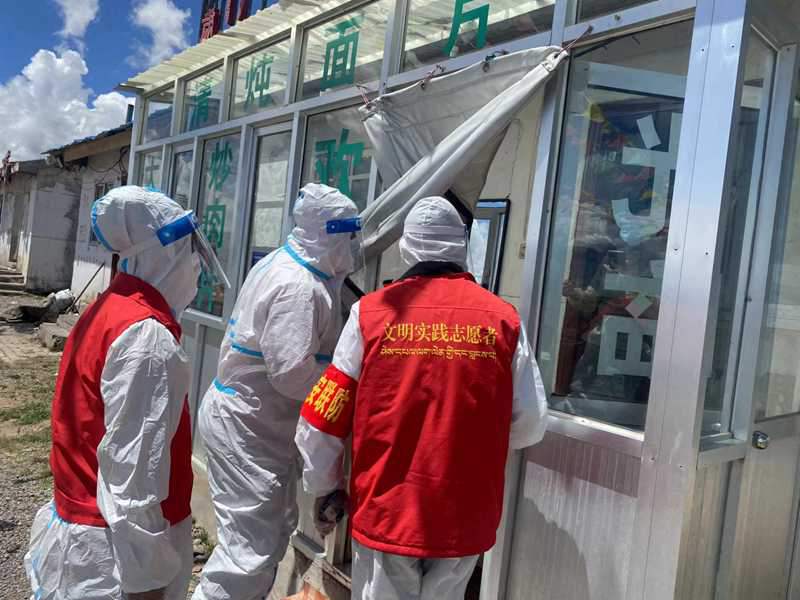 那曲市安多縣帕那鎮新時代文明實踐所志愿者對商鋪進行消殺。圖片由那曲市文明辦提供