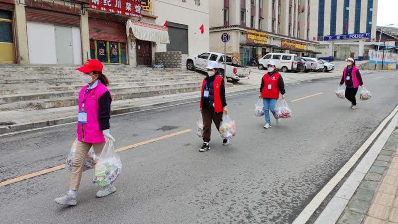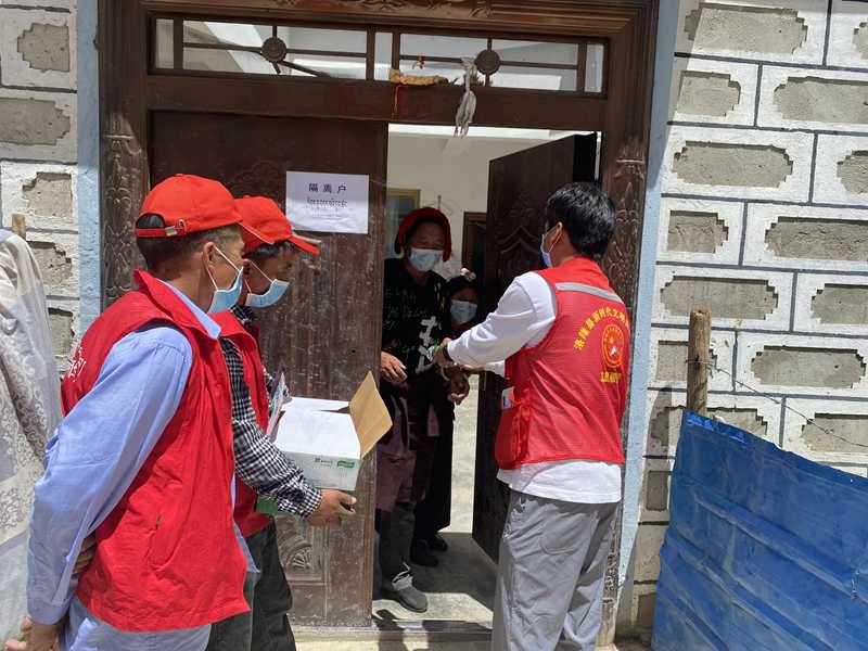 洛隆縣孜托鎮德康社區新時代文明實踐志愿者為社區居家隔離人員配送物資。圖片由昌都市文明辦提供