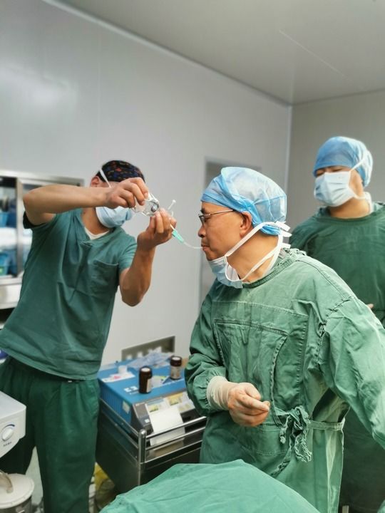 2021年12月24日,重慶醫科大學附屬第一醫院胸心外科副主任、醫療人才“組團式”援藏重慶醫療隊隊長蔣迎九(前)半夜急診,長時間手術術中采用特殊方式飲水解渴。新華社發